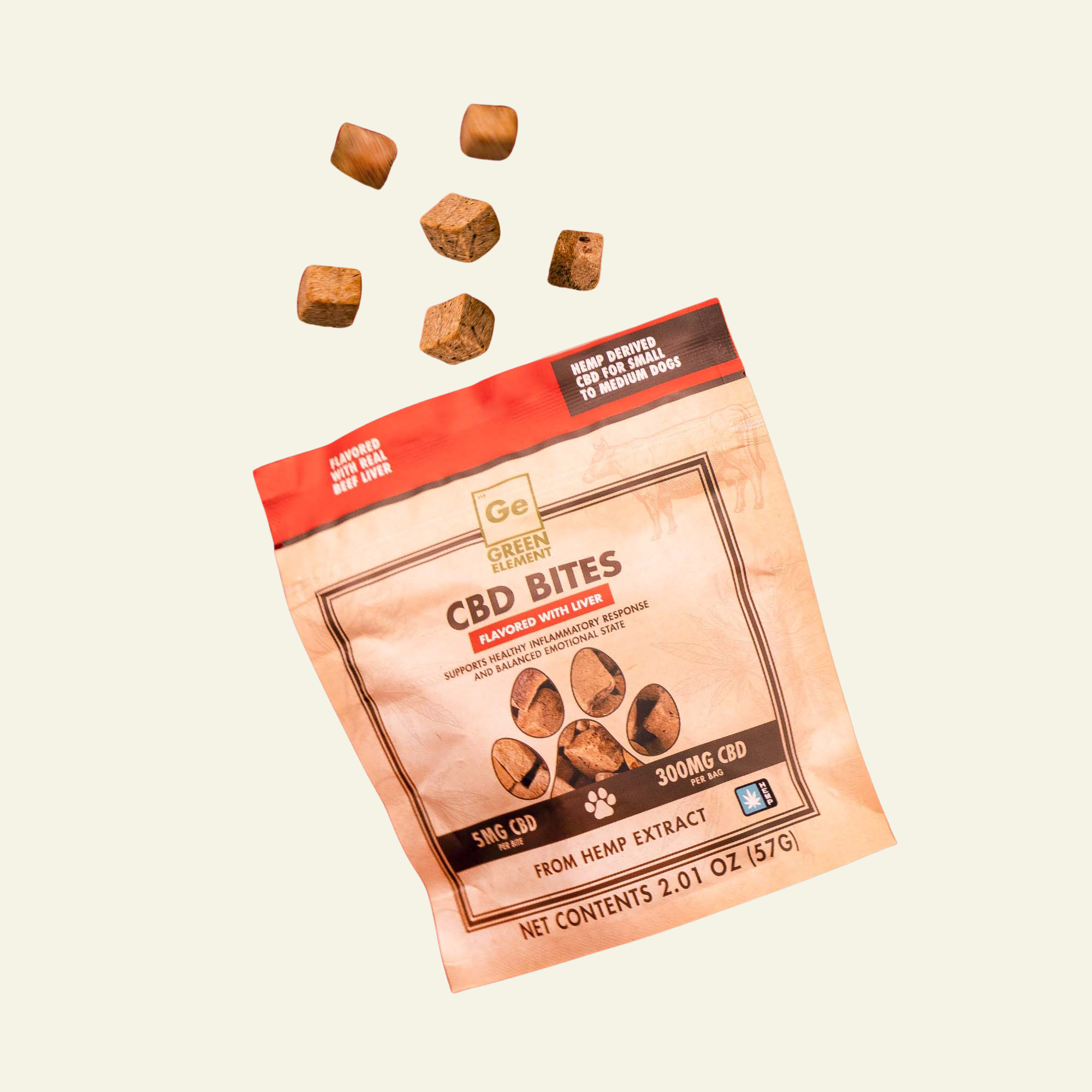 At Green Element, we set out to create the cleanest, most delicious CBD chew for dogs — and we didn’t stop until we nailed it. Our CBD Bites are made with organic full-spectrum hemp extract containing naturally occurring CBD to support your pet’s natural inflammatory response and help maintain a balanced emotional state, especially during times of situational stress. With no preservatives, additives, salt, sugar, or fillers, every bite is crafted with intention — just pure, simple ingredients your pup will love. Available in our original Organic Cheese Recipe and the irresistible Grass-Fed Liver Bites, each formula delivers wellness without compromise.