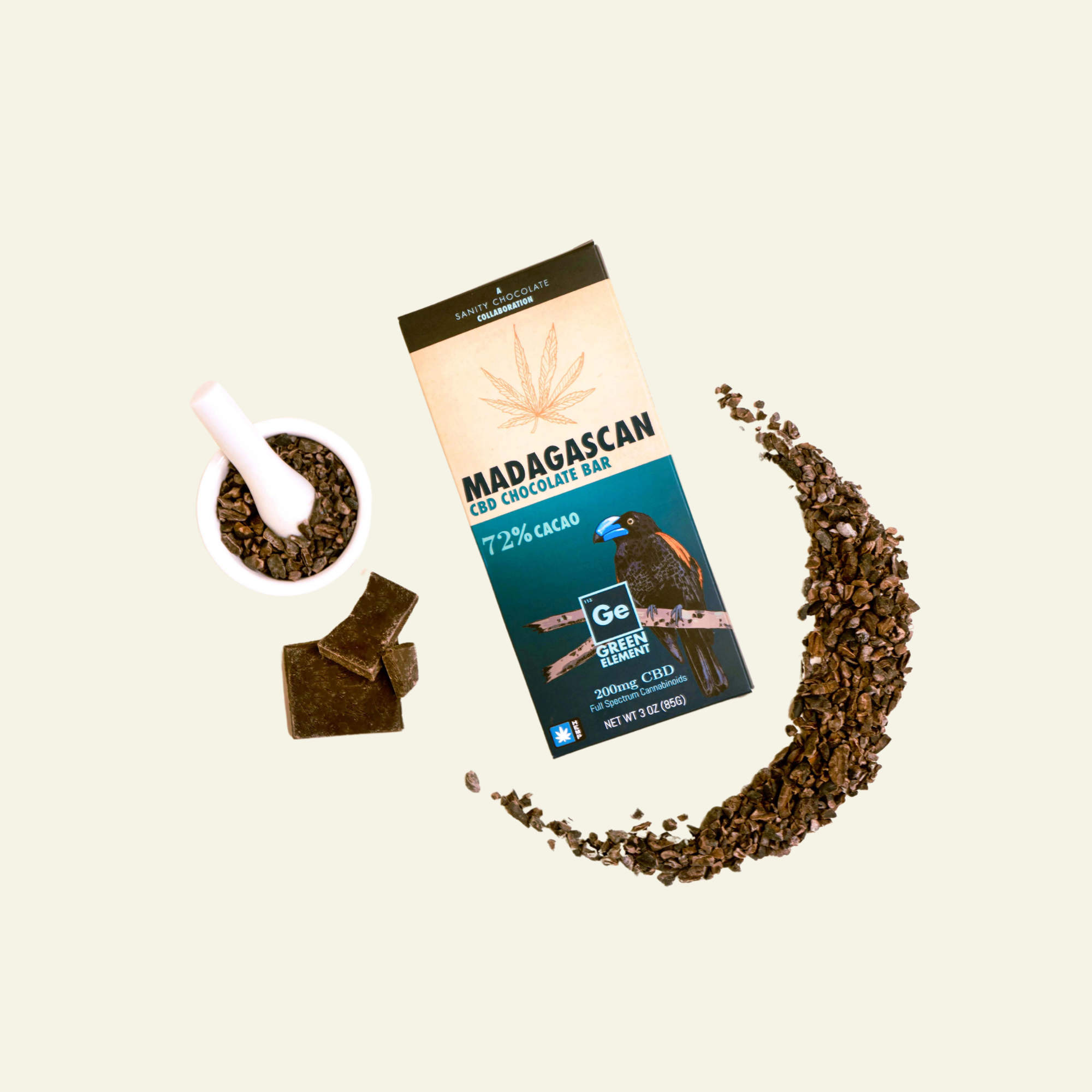 Made with love in Cottage Grove, Oregon, Green Element Chocolate is the result of a collaboration between artisan makers who share a deep passion for crafting honest, organic products for their community. Every bar is hand-made from bean to bar — we husk, mill, temper, and mold each one ourselves using only the finest, sustainably sourced ingredients. Our cacao and coffee are estate-grown, single-origin, and shade-grown, sourced directly from family farms in regions like Madagascar and Peru to preserve the rich, complex flavors unique to their origins. Each 3oz bar is infused with 200mg of CBD and a full spectrum of cannabinoids to elevate your day naturally — no preservatives, no additives, just pure cacao and cannabinoids as nature intended.